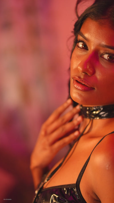 - Details: Choker-style neckline with connecting straps for a bold statement